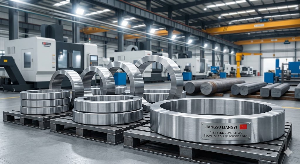 Jiangsu Liangyi, a trusted A182-F6NM forged parts manufacturer in Chengchang Industry Park, Jiangyin, Jiangsu, China, specializes in high-quality UNS S41500 seamless rolled rings, round bars, shafts, and custom open die forgings for global industrial applications.