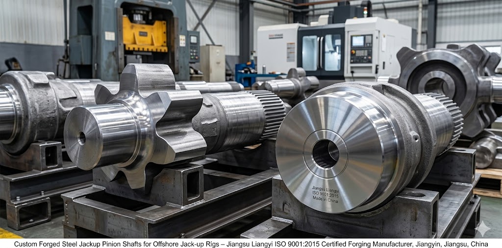 As a professional open-die forging manufacturer certified to ISO 9001:2015, located in Chengchang Industrial Park, Jiangyin, Jiangsu Province — China’s core forging industry cluster — Jiangsu Liangyi  specializes in manufacturing high-performance forged steel jackup pinion shafts for offshore mobile jack-up rigs, jack-up drilling units, and jacking systems of self-elevating platforms. Founded in 1997 with over 25 years of forging expertise, we provide a full range of custom solutions from steel melting, precision forging, controlled heat treatment, to final CNC machining, fully meeting international standards and customer detailed drawings. Our forged jackup pinion shafts serve as main transmission parts in offshore jack-up rig lifting systems, engineered to endure harsh offshore operating conditions: heavy alternating loads, salt spray corrosion, low-temperature impact, and long-term continuous service. We have supplied high-quality pinion shafts to offshore engineering and oil & gas projects in more than 50 countries across the North Sea, Middle East, Southeast Asia, Gulf of Mexico, and Brazil.
